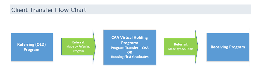 It is important to note that, in HMIS, you cannot create a referral from your program directly into another Program. You must create a referral to one of the virtual CAA holding programs known as Program Transfer- CAA or Housing First Graduates - CAA. Please follow the steps below to complete the process successfully minimize delays that may impact that client. If you are working with a client who needs a transfer to another Housing First program in the Homeless Serving System of Care, please refer this person through Program Transfer. If you are working with a client who is ready to graduate from your Housing First program, please refer this person through Graduates.